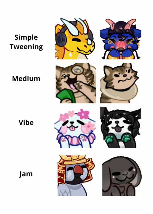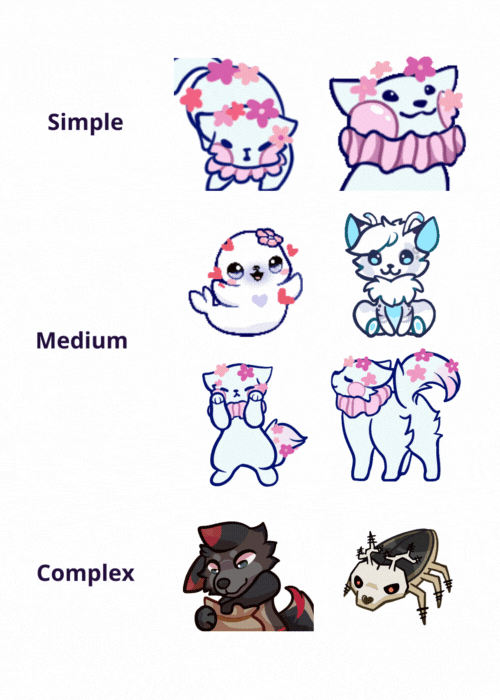 Ranges from 50-75 USD. These are emotes with premade bases. Your character's silhoette and form will be limited to the existing base. (If you like a more custom, the see prices above)Click here to Visit my Ko-fi